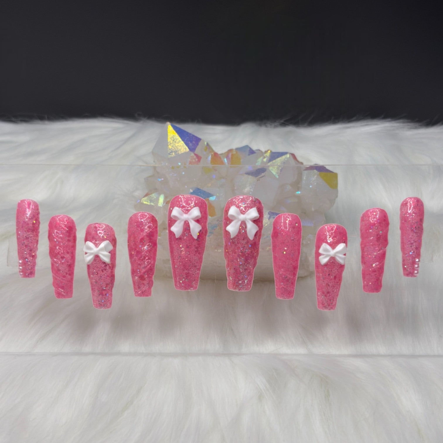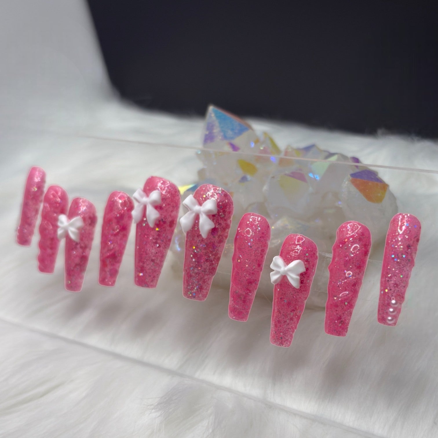 “Bubblegum Bow” — Medium • Long Coffin Pink Jelly Glitter w/ Acrylic Overlay + 3D Bows (RTS)
