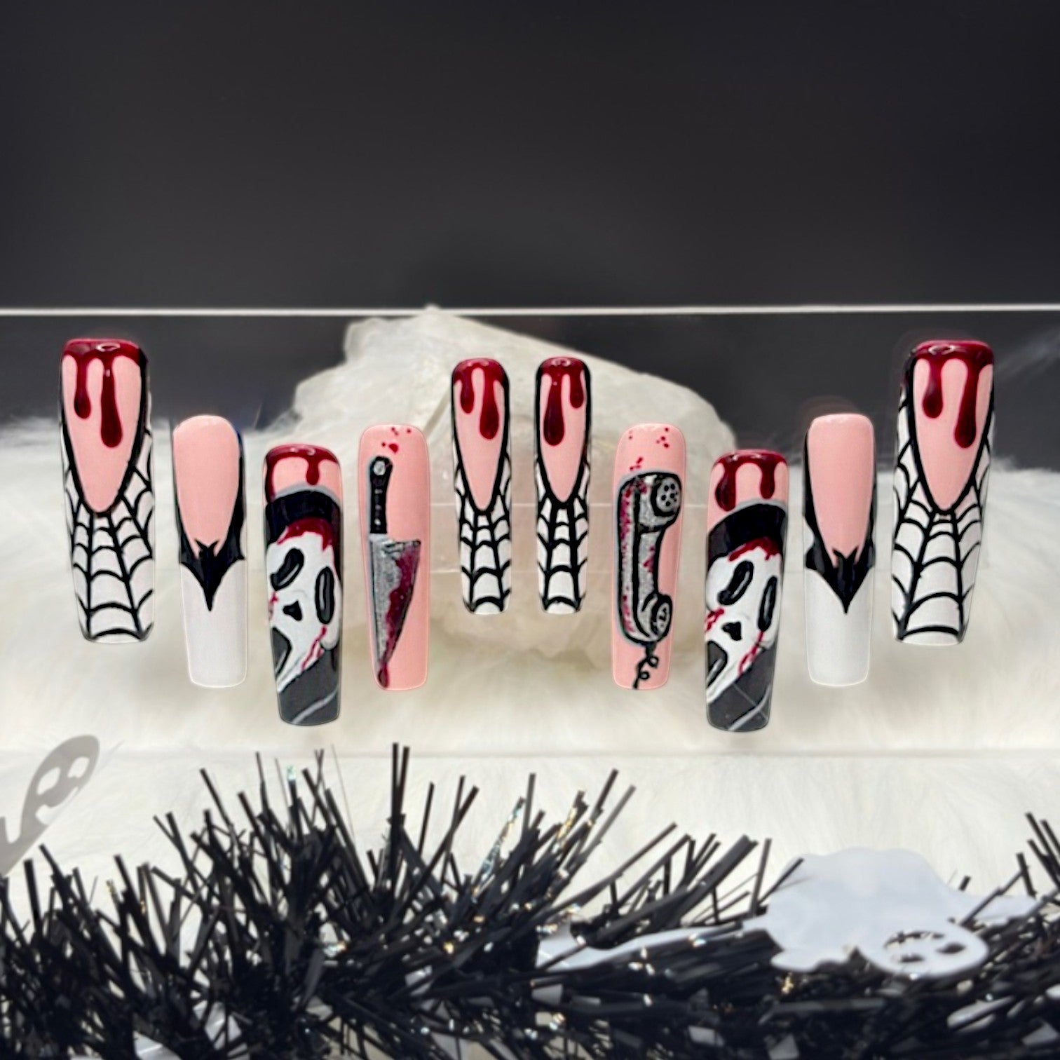 Meet “Hello, Sydney!” — a ready-to-ship, slasher-chic 2XL tapered square set. Hand-painted Ghostface art, webbed details, and 3D blood drips pair with chrome phone + knife effects. Reinforced with a thin builder-gel overlay for strength and a glassy finish.