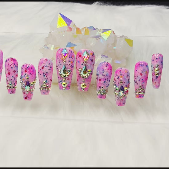 Meet “Jawbreaker Royale” — a ready-to-ship, size-medium long coffin design bursting with bold color, crystal shine, and candy-core chaos. This high-gloss acrylic overlay set features a neon pink and purple speckled base reminiscent of a jawbreaker candy swirl, crowned with luxe rhinestone clusters and teardrop gems.
