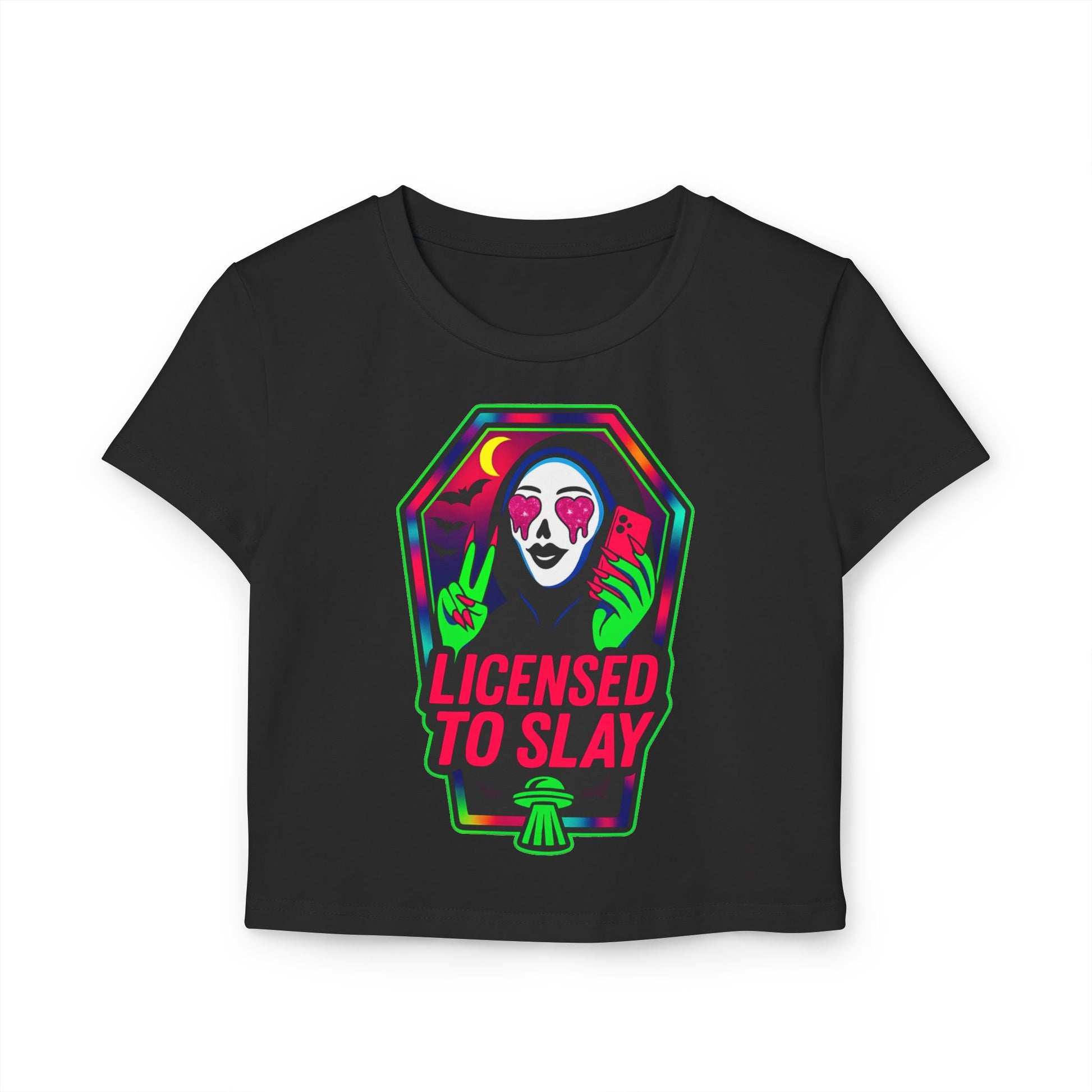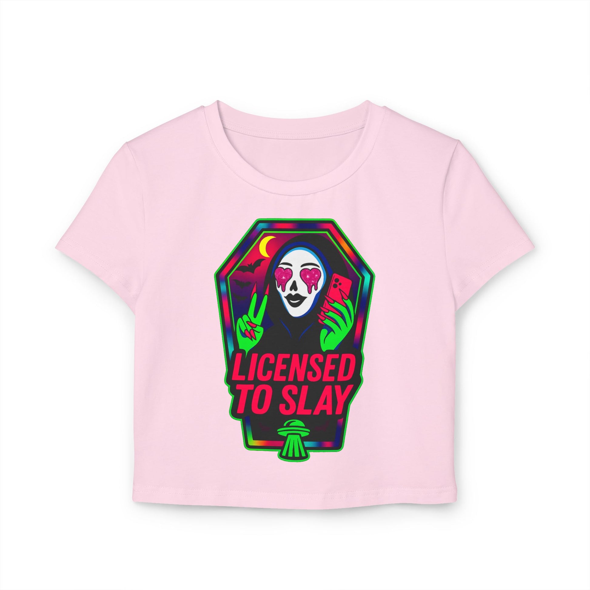 “Licensed to Slay” — Women’s Baby Tee • Horror Glam Nail Icon • Neon Killer Glow