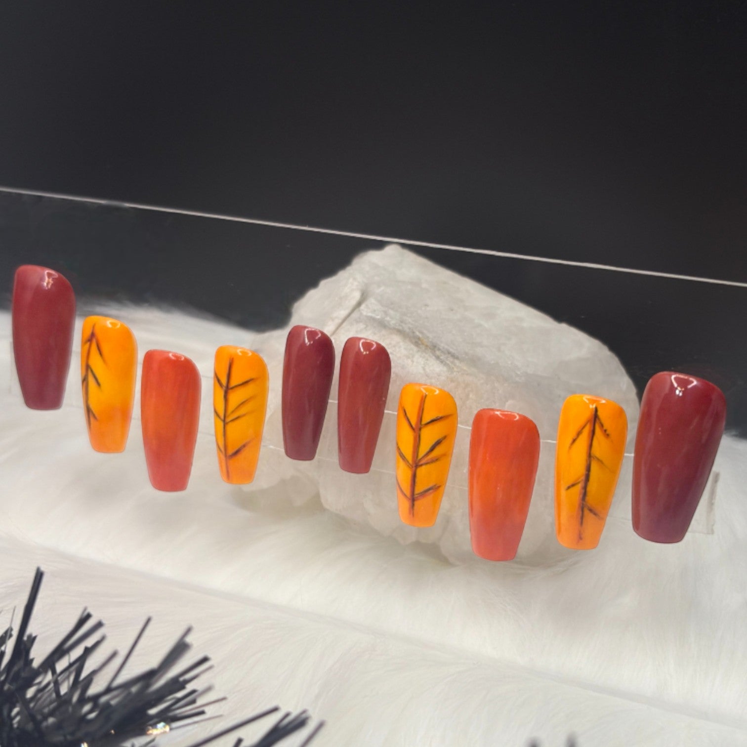 Meet “Maple Hex” — a ready-to-ship, size-XS medium coffin set charmed with autumn magic. Burnt orange, amber, and wine tones fade into a cozy gradient, finished with hand-painted leaf veins. Reinforced with a thin builder-gel overlay for extra strength and glossy wear all season long.