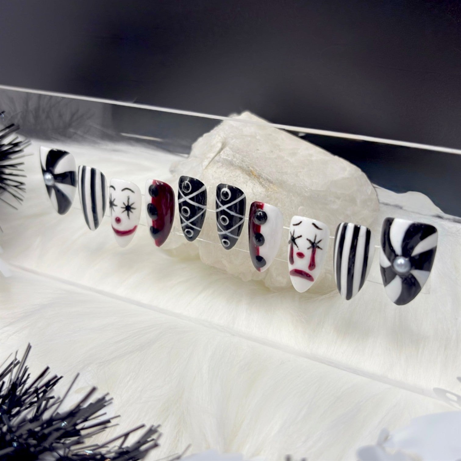 Meet “Midnight Mime” — a ready-to-ship, size-medium almond set inspired by vintage circus macabre. Hand-painted clown faces, black-and-white stripes, and glossy 3D accents evoke haunted carnival vibes that flirt between tragic and glam.
