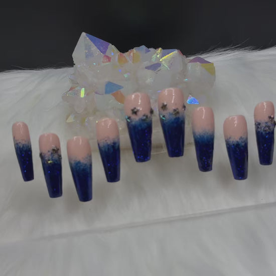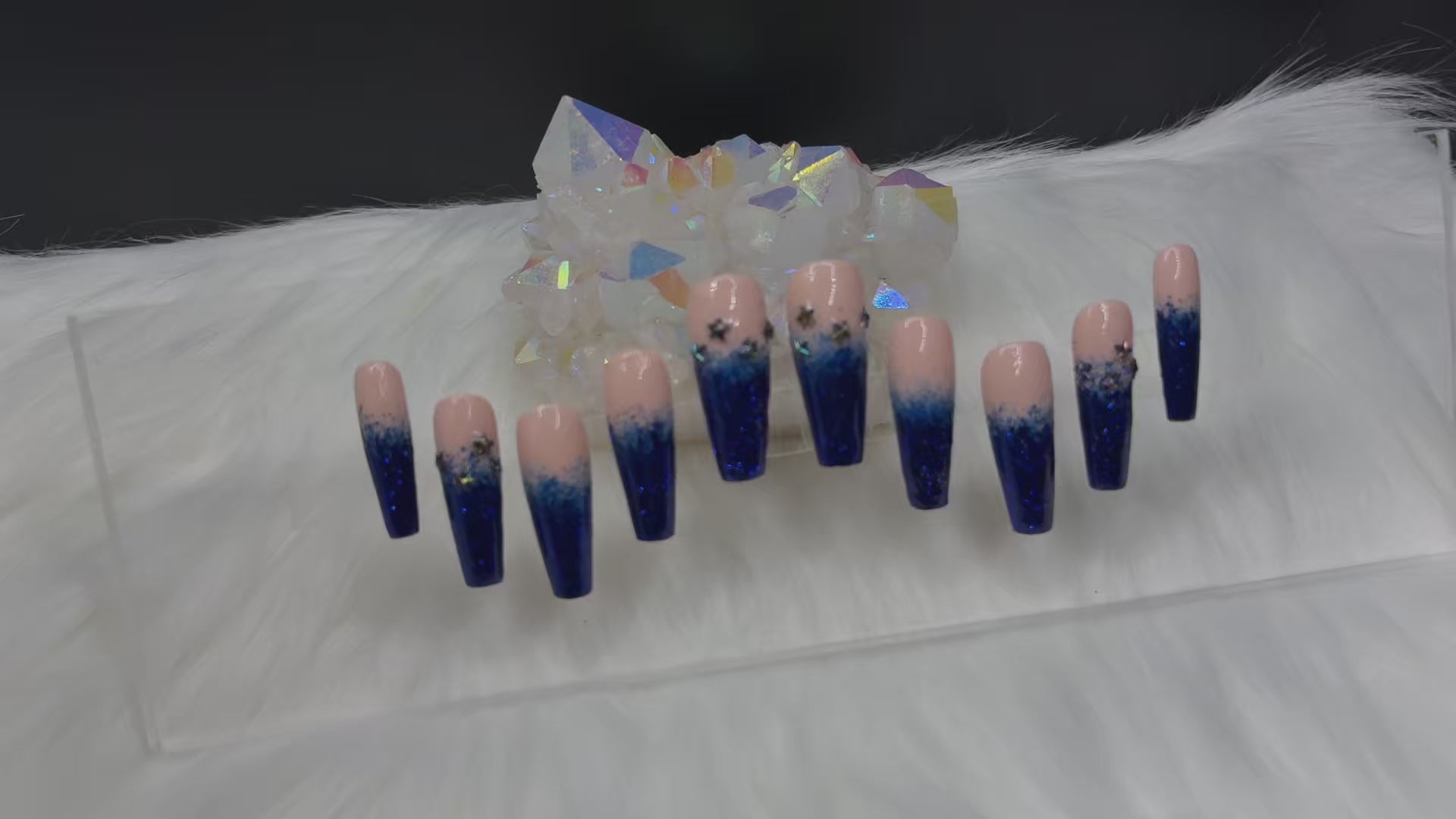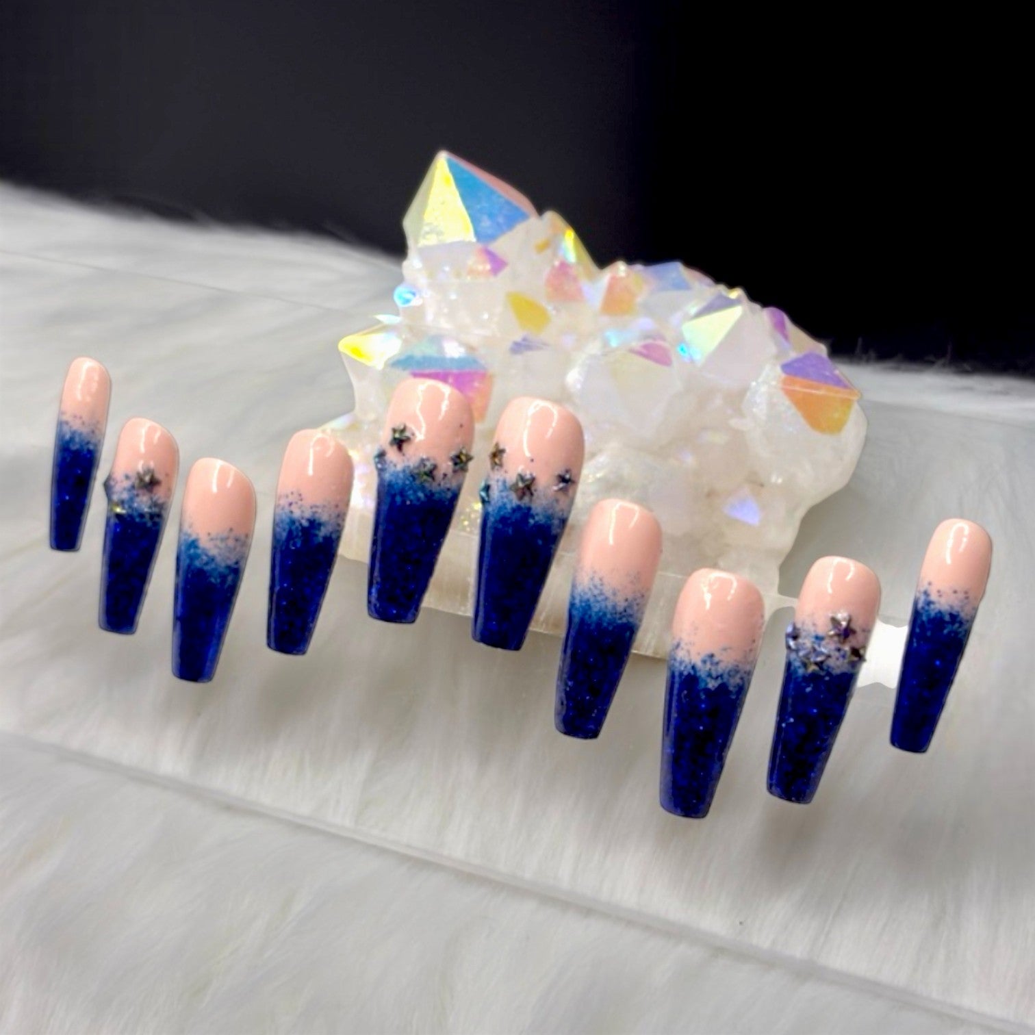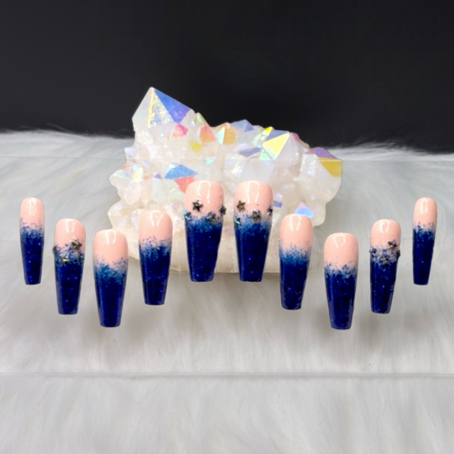 “Midnight Starfall” — Size S- Long Coffin Nude French-Tip Dark Blue Glitter Ombré w/ Acrylic Overlay + Black Star Charms (RTS)