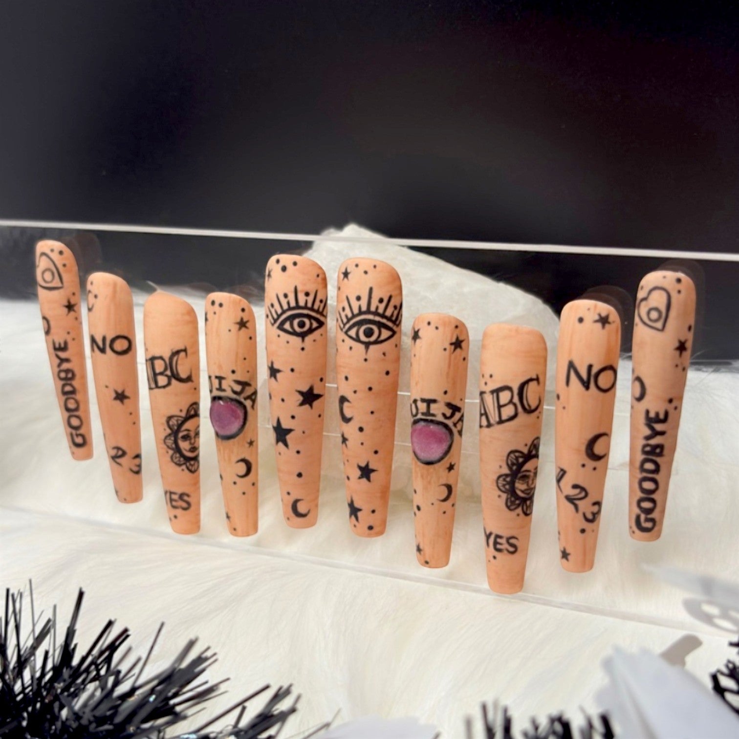 Meet “Spirit Board” — a ready-to-ship, ouija-inspired coffin set designed for the mystically inclined. Each nail features hand-painted planchette details, stars, and celestial markings on a nude base, topped with cat-eye shimmer and reinforced with a thin builder-gel overlay for strength and salon-grade durability.