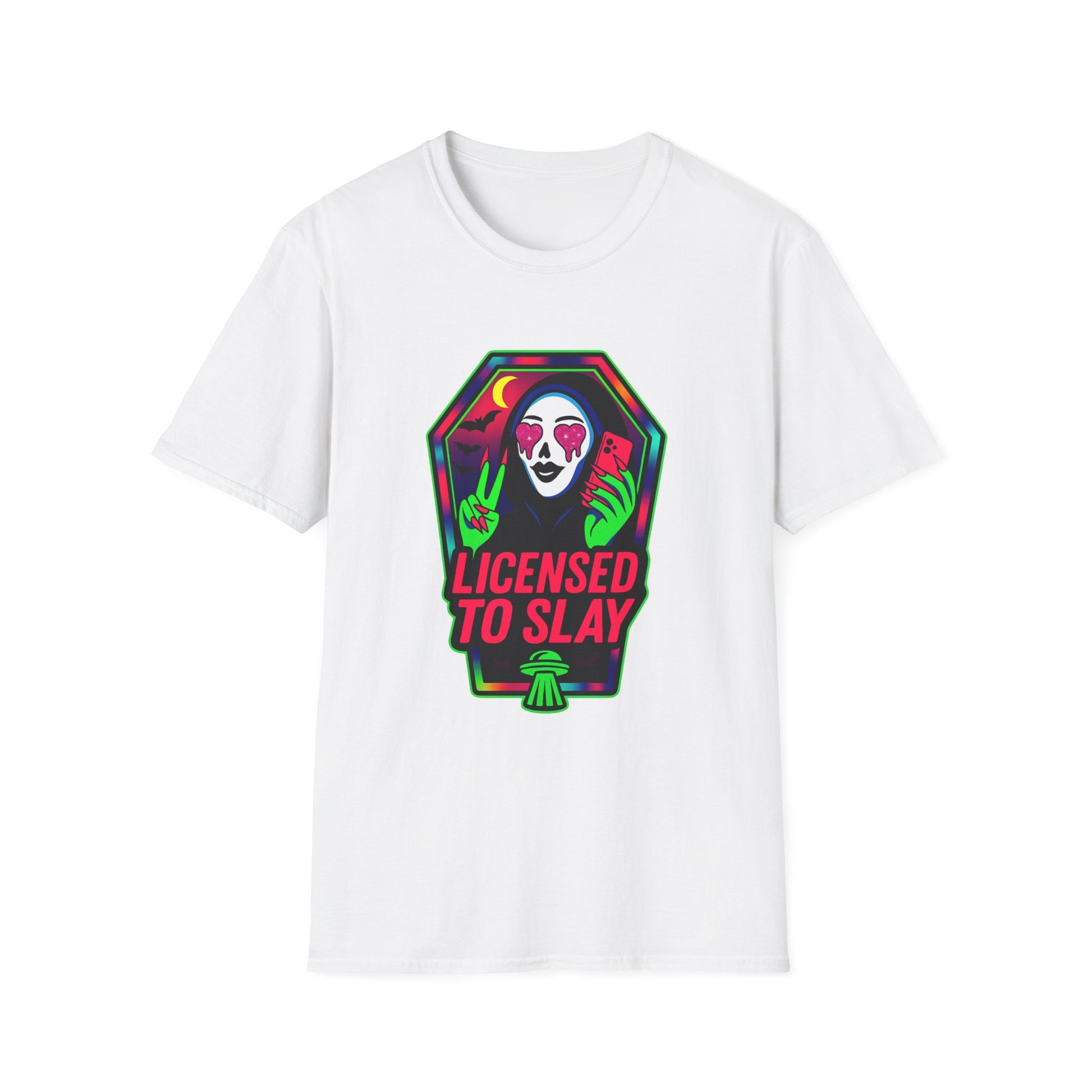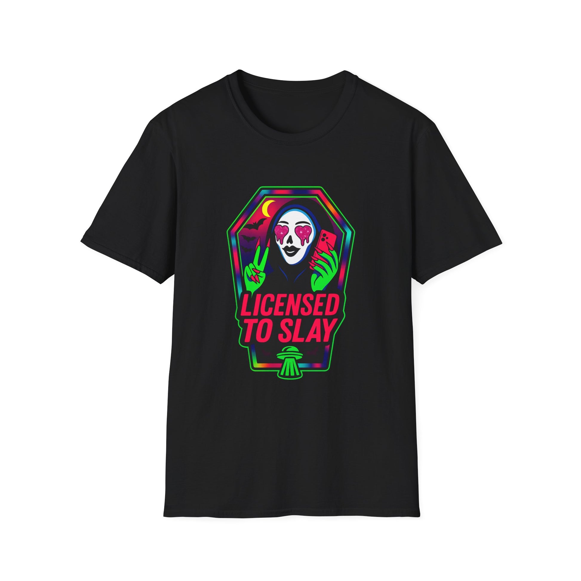“Licensed to Slay” Graphic T-Shirt — Neon Horror Babe Tee (Black/White)